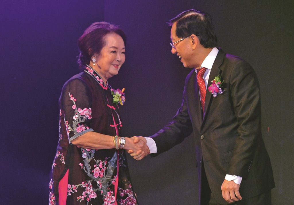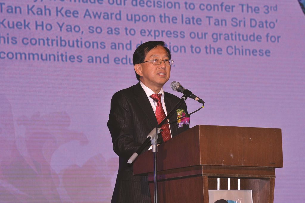 第三届陈嘉庚精神奖受奖人已故丹斯里拿督郭鹤尧幼女拿督郭少荣代父领奖。